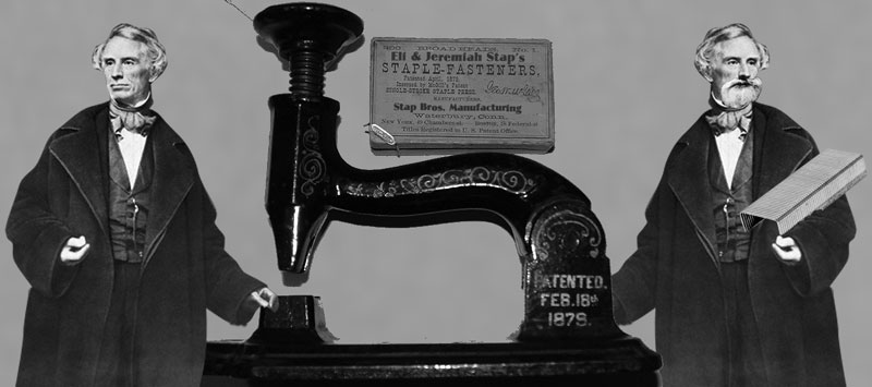 From the post The Stapler: There were twin brothers, the Staps – one invented the staple and one invented the stapler. The next time you pick up a stapler, think of Eli and Jeremiah Stap and their great inventions, one which could not exist without the other: the staple and the stapler. Here’s a picture of Eli and Jeremiah Stap pictured with the very first stapler and staples ever created. Eli is on the left with his hand dangerously close to where the staple would go and Jeremiah on the right, holding the first row of staples ever produced.