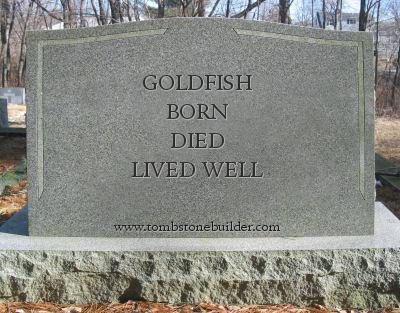 Hm, that’s a lot of words. Now that I think about it, I’m not sure how many words can fit on a tombstone. I’ve never given much thought to the subject. OK then. Let’s make it short and sweet: “Goldfish, born, died, lived well.”