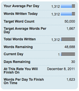 I’m below average. “At this rate, you will finish on December 8, 2011.” 48,688 words remaining. Harrumph. Well, that’s very discouraging.