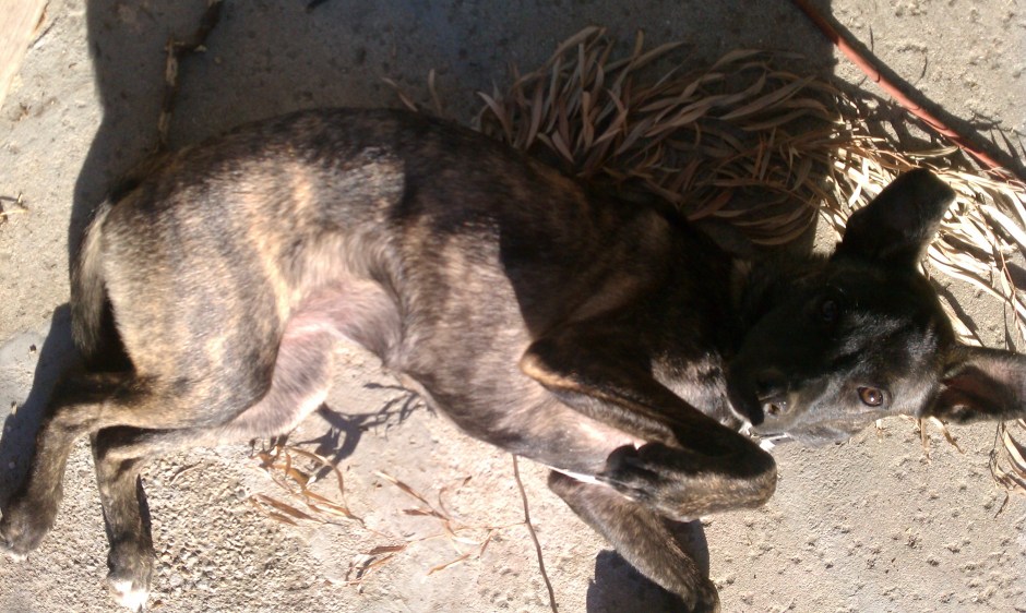 It took me a while to figure out how she was getting in there. I had to catch her in the act. At first, I thought maybe she was jumping over it, but no. She shimmies under the fence like a goddamn prison escapee. Why it is that she feels that she can crawl in that way, but not out remains a mystery. While she was in there, she discovered that there’s a whole new world of digging to be done. She dug under the pomegranate tree right down to the roots. I’m not sure that it will make it. It’s touch and go.