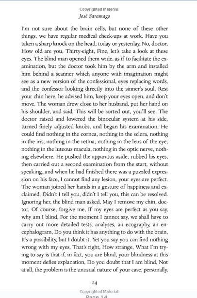 So, when I read two books, accidentally back to back, that disregard those rules of language, I wonder why. Here is a page from the last book I read, José Saramago‘s Blindness: