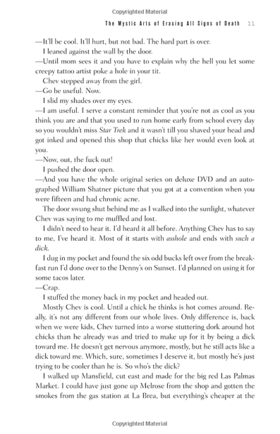 And here is a page from the book I’m reading now, Charlie Huston‘s The Mystic Arts of Erasing All Signs of Death: A Novel: