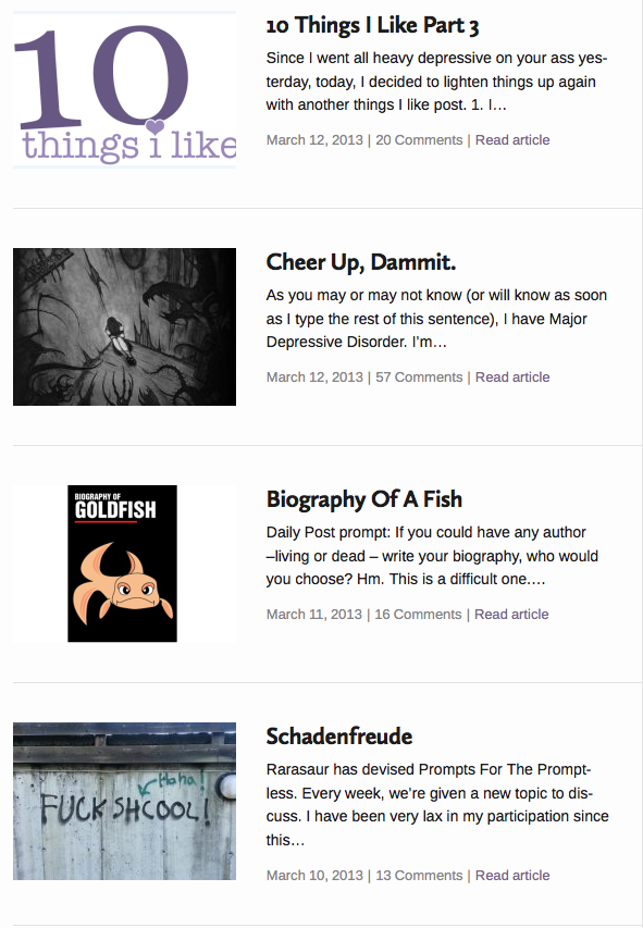 Today, we are displaying a theme called Watson. I kind of like it, but at the same time, I don’t like it. I don’t like how there’s no sidebar on the individual post pages. I don’t like how Watson’s post formats have screwed up every single post in which I’ve ever used quotes. Hopefully, there’s enough that I do like about it to keep it sticking around. Otherwise I might have to switch again.