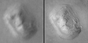 A satellite photo of a mesa in Cydonia, often called the Face on Mars. Later imagery from other angles did not contain the illusion. Image from Wiki.