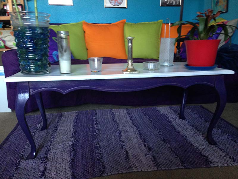 A long time ago, I bored you all with my do-it-yourself-ness. I talked about painting a coffee table, but I never did show you the finished results. Here it is in all of its purple glory: