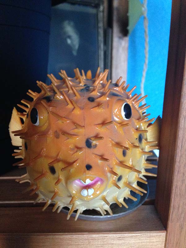 Moving on to the bric-a-brac. Somewhere in this house, I have a real blowfish that I got in Florida as a kid. He’s all puffed out and lacquered. Honestly, he’s kind of gross. When I went to take a picture of him this morning, I couldn’t find him. I found this guy at a thrift store and for 50 cents, he was too good to refuse.