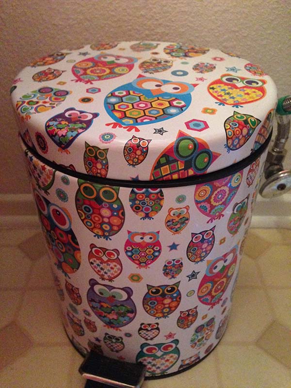 Also residing in my bathroom is this incredibly busy trash can. Fortunately, it’s rather small so its garishness isn’t too obtrusive. It was dented when I bought it for $1. I took a hammer to it and smoothed out the dent. Now you can’t even tell.