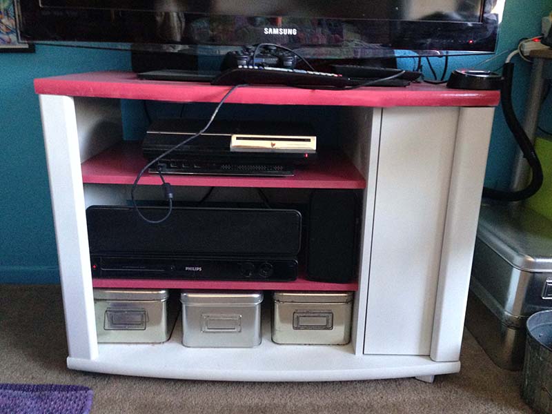 When Male left, he bequeathed me a lot of stuff. He left me his California king size bed, his giant television and a PlayStation 3. Yay me! I lived in a tiny room before and I used bookshelves for everything. My bookshelves held books, but they were also used as a place to feed the cat where the dog couldn’t get to his food, a closet, a vanity and an entertainment center. This giant new TV wouldn’t fit on my bookshelves so it needed a new home. I searched long and hard and finally found an awful, ugly, fake wood, press board thing. I painted the hell out of it until it turned into this: