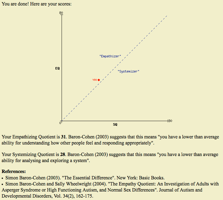 According to the test, I’m almost right in the middle. I have a “lower than average ability for understanding how other people feel and responding appropriately” and “a lower than average ability for analyzing and exploring a system.”