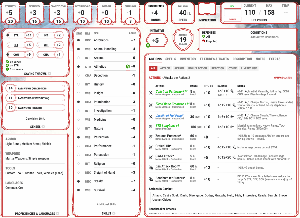 Before the Gunslinger left though, I decided to switch classes in an effort to increase my damage and play a more interesting character. I switched from Monk back to Barbarian without my bear animal companion. I am now a level 12 Totem Warrior Half-Orc Barbarian. I chose Totem Warrior so my bear could be with me in spirit. Below is my online character sheet. We left off in the middle of a battle, which is why I’m down hit points. And I’m currently raging so my stats are buffed.